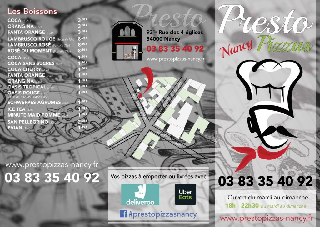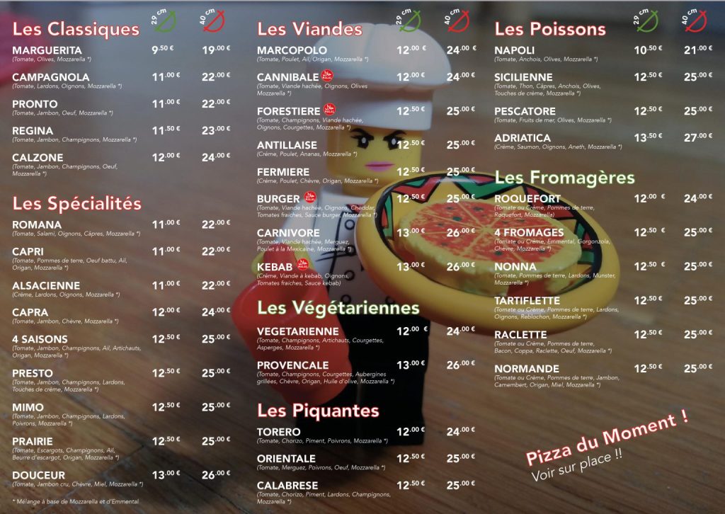 Notre menu Les favoris Normale Géante La ProntoTomate, jambon, œuf, mozzarella 11€ 22€ La CarnivoreTomate, viande hachée, merguez, poulet à la mexicaine, mozzarella 13€ 26€ La RacletteTomate ou crème, pomme de terre, jambon, camembert, origan, miel, mozzarella 12.50€ 25€ La carte complète